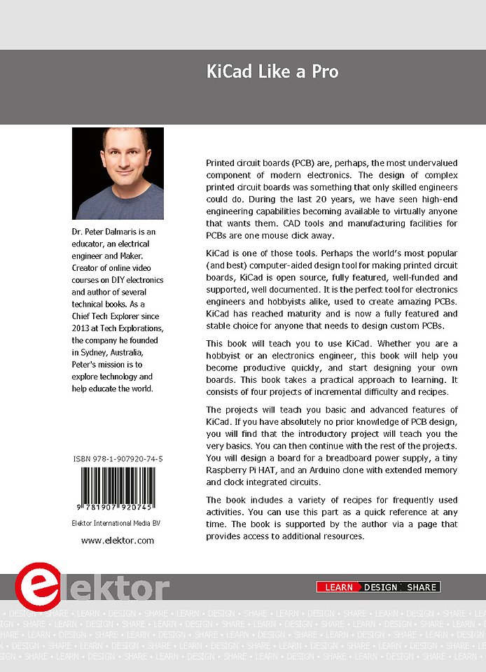 This book will teach you to use KiCad (version 5.0). Whether you are a hobbyist or an electronics engineer, this book will help you become productive quickly, and start designing your own boards. This book takes a practical approach to learning. It consists of four projects of incremental difficulty and recipes.