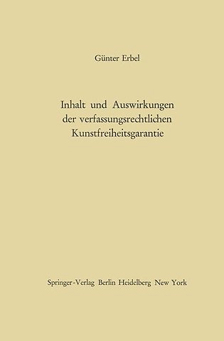 Erster Teil:Der Inhalt der verfassungsrechtlichen Kunstfreiheitsgarantie.- Erster Abschnitt: Die Bestimmung des Begriffs „Kunst” im Sinne des Art. 5 Abs. 3 Satz 1 GG 1.- A. Die Schwierigkeiten einer Definition des Begriffs „Kunst”.- B. Ubersicht über die bisherigen Definitionsversudie.- C. Die eigene Begriffsbestimmung auf dem Wege der Verfassungsauslegung.- Zweiter Abschnitt: Die „Freiheit” der Kunst 99.- A. Der Inhalt der Freiheit (Die Bedeutung der Aussage: „ist frei”).- B. Die Schranken der Kunstfreiheit.- Zweiter Teil: Auswirkungen der Kunstfreiheitsgarantie.- A. Kunstfreiheitsgarantie und Landesverfassungsrecht.- B. Kunstfreiheit und Strafrecht.- C. Kunstfreiheit und Polizei.- D. Kunstfreiheit und Jugendschutz.- E. Kunstfreiheit und Baurecht.- F. Kunstfreiheit und Gewerberecht.- G. Kunstfreiheit und staatliche (kommunale) Kunstpflege.- H. Kunstfreiheit und Theater.- I. Kunstfreiheit und Massenkommunikationsmittel.- J. Kunstfreiheit und Privatrecht (Frage der Drittwirkung der Kunstfreiheitsgarantie).- K. Kunstfreiheit im besonderen Gewaltverhältnis (Erörterung am Beispiel des Kunstunterrichts in den öffentlichen Schulen).- Dritter Teil:.- A. Verwirkbarkeit des Grundrechts auf freie künstlerische Entfaltung nach Art. 18 GG?.- B. Geltung des Grundrechts auf freie künstlerische Entfaltung für „juristische Personen” gemäß Art. 19 Abs. 3 GG?.- C. Der Sachverständige in „Kunstprozessen”.- Literatur.