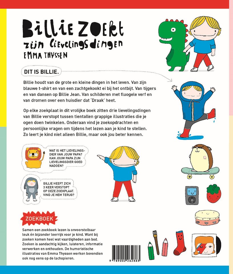Billie houdt van de grote en kleine dingen in het leven. Van zijn blauwe t-shirt en van een zachtgekookt ei bij het ontbijt. Van tijgers en van dansen op Billie Jean. Van schilderen met fluogele verf en van dromen over een huisdier dat 'Draak’ heet. Op elke zoekplaat in dit vrolijke boek zitten drie lievelingsdingen van Billie verstopt tussen tientallen grappige illustraties die je ogen doen twinkelen. Onderaan vind je zoekopdrachten en persoonlijke vragen om tijdens het lezen aan je kind te stellen. Zo leert je kind niet alleen Billie, maar ook jou beter kennen. Samen een zoekboek lezen is onvoorstelbaar leuk én bijzonder leerrijk voor je kind. Want bij zoeken komen heel wat vaardigheden aan bod. Zoeken is aandachtig kijken, luisteren, informatie verwerken en onthouden. De humoristische illustraties van Emma Thyssen werken bovendien ook nog eens op de lachspieren.