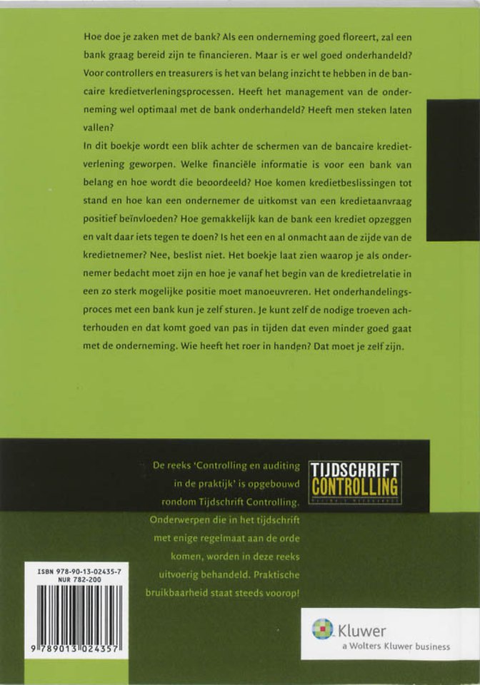 In dit boekje wordt een blik achter de schermen van de bancaire kredietverlening geworpen. Welke financiële informatie is voor een bank van belang en hoe wordt die beoordeeld? Hoe komen kredietbeslissingen tot stand en hoe kan een ondernemer de uitkomst van een kredietaanvraag positief beïnvloeden? Hoe gemakkelijk kan de bank een krediet opzeggen en valt daar iets tegen te doen?