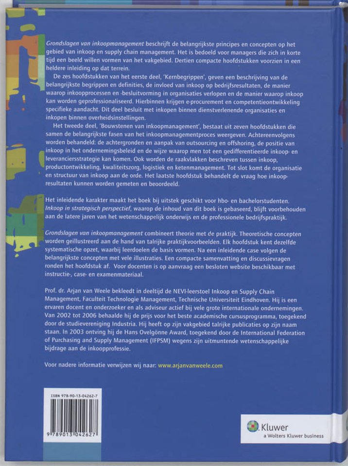 Meer over Arjan van Weele'Grondslagen van inkoopmanagement' beschrijft de belangrijkste principes en concepten op het gebied van inkoop en supply chain management. Het is bedoeld voor managers die zich in korte tijd een beeld willen vormen van het vakgebied. Het is om deze reden minder gedetailleerd dan 'Inkoop in Strategisch Perspectief', waarop de inhoud is gebaseerd. In dertien compacte hoofdstukken krijgt de lezer een beeld van het vakgebied.
