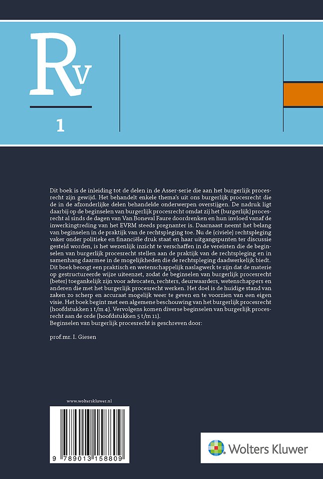Asser Procesrecht 1 Beginselen van burgerlijk procesrecht is de algemene inleiding van de Asser Procesrecht-reeks, en bespreekt enkele thema’s uit ons burgerlijk procesrecht die de elders in de reeks uitvoeriger besproken specifieke onderdelen van dat procesrecht overstijgen. Daarbij ligt de focus op de beginselen van burgerlijk procesrecht als hét overkoepelende, alle delen in de reeks verbindende thema.