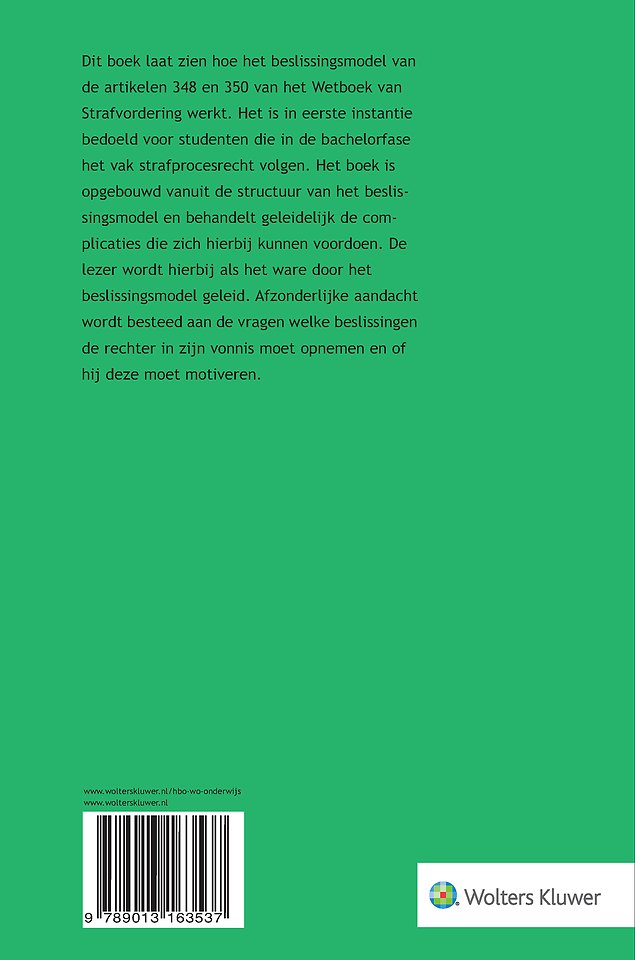 Het beslissingsmodel van 348/350 Sv laat zien hoe het beslissingsmodel van de artikelen 348 en 350 van het Wetboek van Strafvordering werkt. De uitgave is opgebouwd volgens de structuur van het beslissingsmodel en behandelt geleidelijk alle complicaties die zich kunnen voordoen. Als lezer wordt u daardoor als het ware door het beslissingsmodel geleid. Afzonderlijke aandacht wordt besteed aan de beslissingen die de rechter in zijn vonnis moet opnemen en of hij deze moet motiveren.