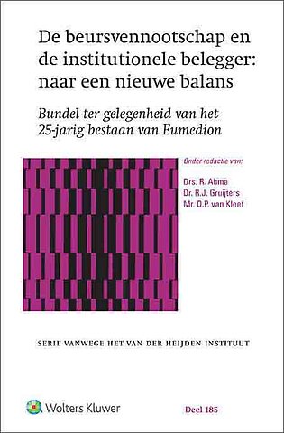 In De beursvennootschap en de institutionele belegger: naar een nieuwe balans gaan verschillende auteurs in op de vermaatschappelijking van zowel de beursvennootschappen als de institutionele beleggers. Er wordt besproken of we toegaan naar een nieuw paradigma op het terrein van corporate governance (van agentschapstheorie naar stewardshiptheorie) en ook de impact van de vele duurzaamheidsinformatie die beursvennootschappen de komende jaren gaan publiceren komt aan de orde.