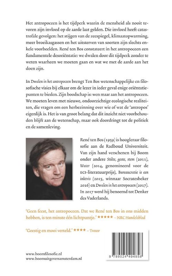 Het Antropoceen is de in de wetenschap steeds courantere naam van het tijdperk waarin de mens als eerste soort invloed uitoefent op het klimaat, op de oceanen en op de aarde zelf. 'Antropoceen' is over het algemeen een alarmerend of apocalyptisch concept. De invloed van de mens op de aarde lijkt immers verre van positief. René ten Bos constateert in Dwalen in het Antropoceen een grootschalige verdwazing in onze samenleving ten aanzien van een belangrijke kwestie als klimaatverandering.