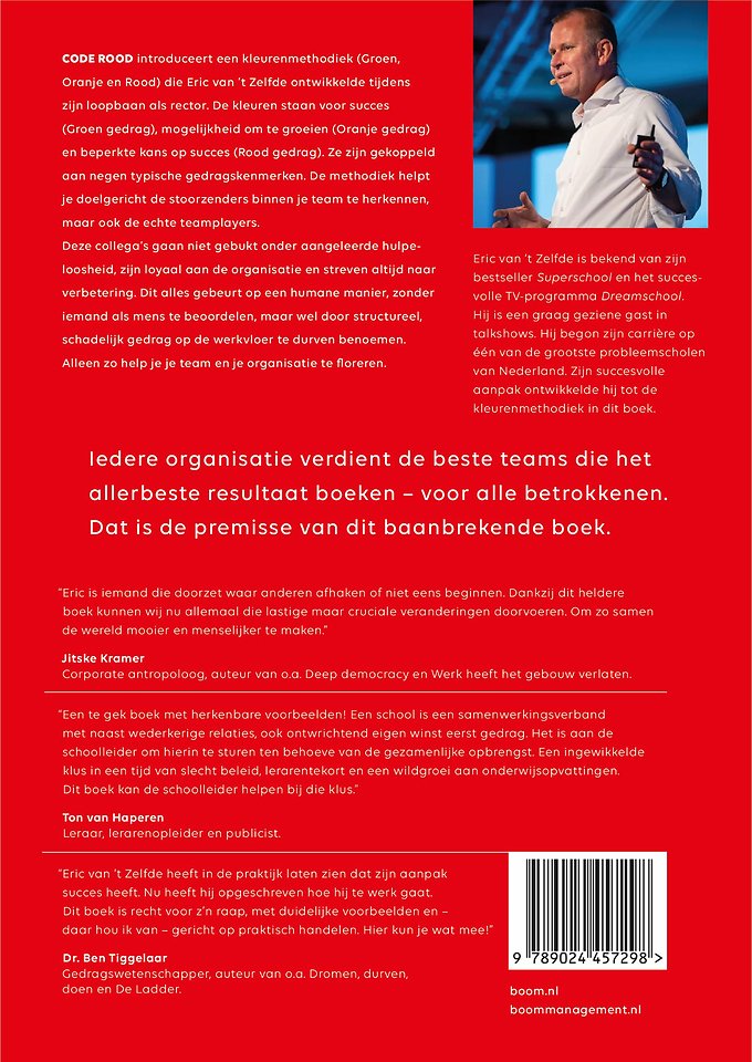 Code Rood introduceert een kleurenmethodiek (Groen, Oranje en Rood) die Eric van ’t Zelfde ontwikkelde tijdens zijn loopbaan als rector. De kleuren staan voor succes (Groen gedrag), mogelijkheid om te groeien (Oranje gedrag) en beperkte kans op succes (Rood gedrag). Ze zijn gekoppeld aan negen typische gedragskenmerken. De methodiek helpt je doelgericht de stoorzenders binnen je team te herkennen, maar ook de echte teamplayers. Deze collega’s gaan niet gebukt onder aangeleerde hulpeloosheid, zijn loyaal aan de organisatie en streven altijd naar verbetering. Dit alles gebeurt op een humane manier, zonder iemand als mens te beoordelen, maar wel door structureel, schadelijk gedrag op de werkvloer te durven benoemen. Alleen zo help je je team en je organisatie te floreren.