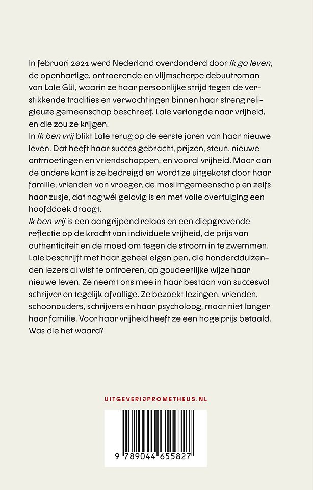 Ik ben vrij is een aangrijpend relaas en een diepgravende reflectie op de kracht van individuele vrijheid, de prijs van authenticiteit en de moed om tegen de stroom in te zwemmen. Lale beschrijft met haar geheel eigen pen, die honderdduizenden lezers al wist te ontroeren, op goudeerlijke wijze haar nieuwe leven. Ze neemt ons mee in haar bestaan van succesvol schrijver en tegelijk afvallige. Ze bezoekt lezingen, vrienden, schoonouders, schrijvers en haar therapeut, maar niet langer haar familie. Voor haar vrijheid heeft ze een hoge prijs betaald. Was die het waard?