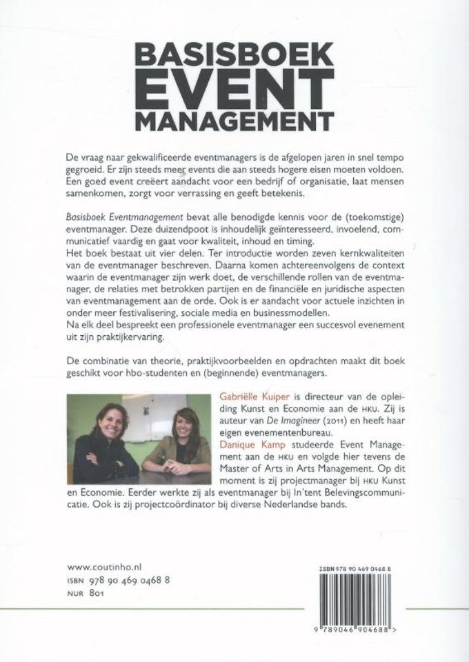 Basisboek Eventmanagement bevat alle benodigde kennis voor de (toekomstige) eventmanager. Deze duizendpoot is inhoudelijk geïnteresseerd, invoelend, communicatief vaardig en gaat voor kwaliteit, inhoud en timing. Het boek bestaat uit vier delen. Ter introductie worden de zeven kernkwaliteiten van de eventmanger beschreven. Daarna komen achtereenvolgens de context waarin de eventmanager zijn werk doet, de verschillende rollen van de eventmanager, de relaties met betrokken partijen en de financiële en juridische aspecten van eventmanagement aan de orde. Ook is er aandacht voor actuele inzichten over onder meer festivalisering, sociale media en businessmodellen. Na elk deel bespreekt een professionele eventmanager een succesvol evenement uit zijn praktijkervaring.