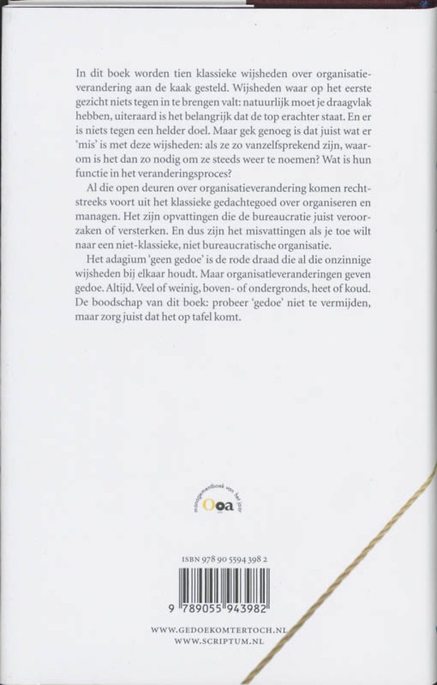 Het adagium 'geen gedoe' is de rode draad die al die onzinnige wijsheden bij elkaar houdt. Maar organisatieveranderingen geven gedoe. Altijd. Veel of weinig, boven- of ondergronds, heet of koud. De boodschap van dit boek: probeer 'gedoe' niet te vermijden, maar zorg juist dat het op tafel komt.