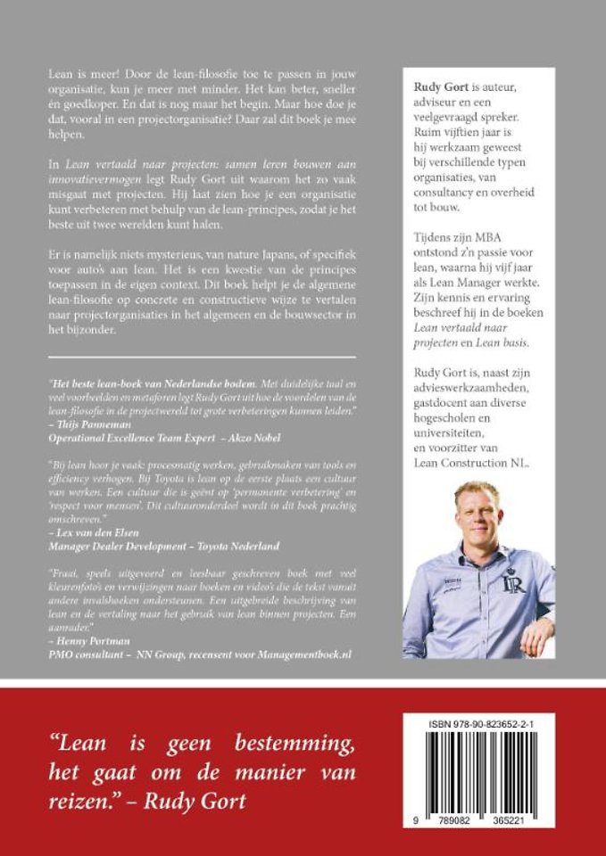 'Het beste lean-boek van Nederlandse bodem. Met duidelijke taal en veel voorbeelden en metaforen legt Rudy Gort uit hoe de voordelen van de lean-filosofie in de projectwereld tot grote verbeteringen kunnen leiden.' - Thijs Panneman – Operational Excellence Team Expert – Akzo Nobel