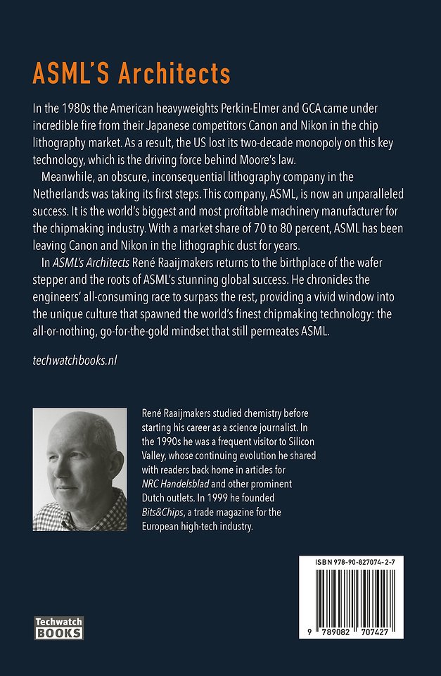 With a market share of 70 to 80 percent, ASML has been leaving Canon and Nikon in the lithographic dust for years. In 'ASML’s Architects' René Raaijmakers returns to the birthplace of the wafer stepper and the roots of ASML’s stunning global success. He chronicles the engineers’ all-consuming race to surpass the rest, providing a vivid window into the unique culture that spawned the world's finest chipmaking technology: the all-or-nothing, go-for-the-gold mindset that still permeates ASML.