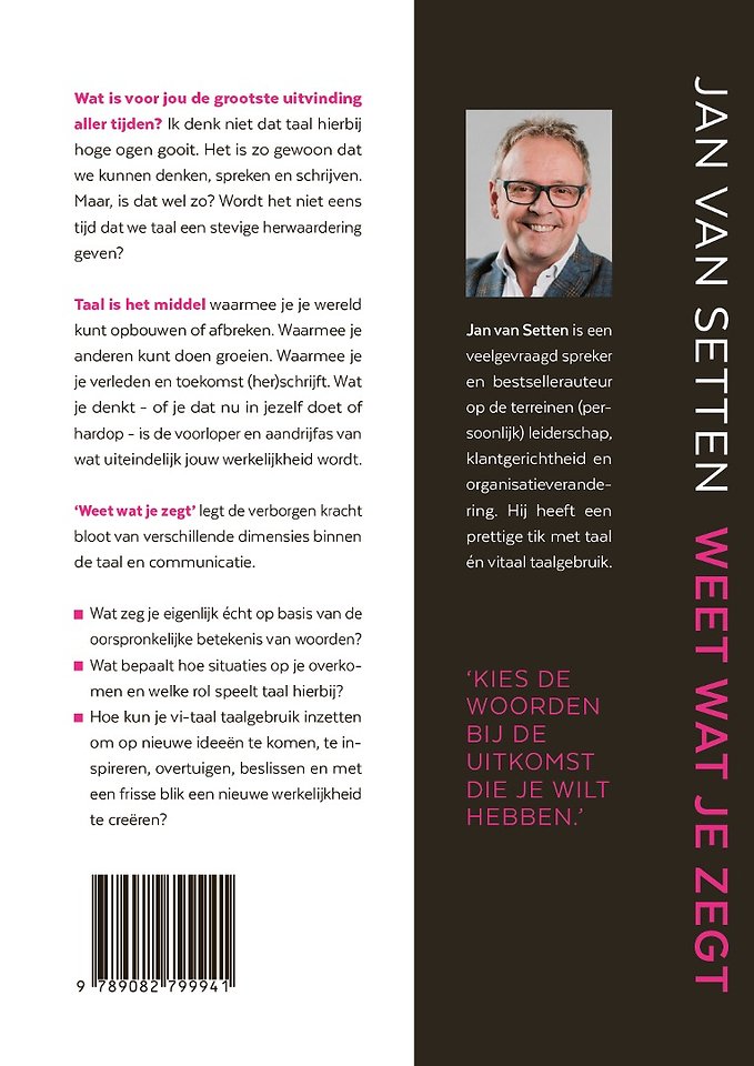 Meer over Jan van SettenWat is voor jou de grootste uitvinding aller tijden? Ik denk niet dat taal hierbij hoge ogen gooit. Het is zo gewoon dat we kunnen denken, spreken en schrijven. Maar, is dat wel zo? Wordt het niet eens tijd dat we taal een stevige herwaardering geven?