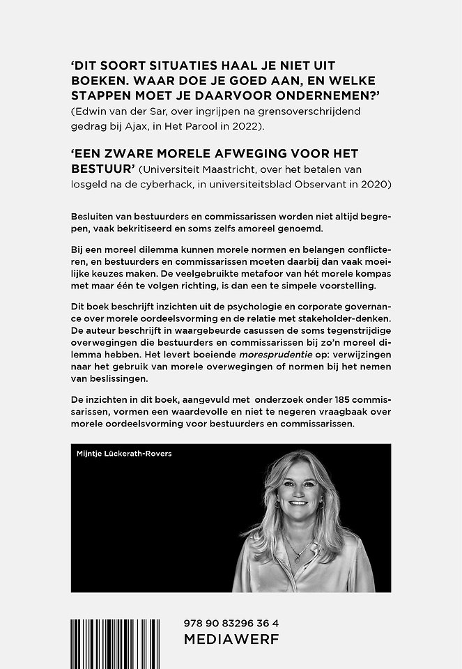 Meer over Mijntje Lückerath-RoversShortlist Managementboek van het Jaar 2024 Besluiten van bestuurders en commissarissen worden niet altijd begrepen, vaak bekritiseerd en soms zelfs amoreel genoemd. Bij een moreel dilemma kunnen morele normen en belangen conflicteren, en bestuurders en commissarissen moeten daarbij dan vaak moeilijke keuzes maken. De veelgebruikte metafoor van hét morele kompas met maar één te volgen richting, is dan ook een te simpele voorstelling. Dit boek beschrijft inzichten uit de psychologie en corporate governance over morele oordeelsvorming, morele identiteit en de relatie met stakeholder-denken. De praktische handvatten kunnen behulpzaam zijn bij morele dilemma’s in de boardroom. De auteur beschrijft in waargebeurde casussen de soms tegenstrijdige overwegingen die bestuurders en commissarissen bij zo’n moreel dilemma hebben. Het levert boeiende moresprudentie op: verwijzingen naar het gebruik van morele overwegingen of normen bij het nemen van beslissingen in morele dilemma’s. De inzichten in dit boek, aangevuld met onderzoek onder 185 commissarissen, vormen een waardevolle en niet te negeren vraagbaak over morele oordeelsvorming voor bestuurders en commissarissen. 'Een zware morele afweging voor het bestuur' - Universiteit Maastricht, over het betalen van losgeld na de cyberhack, in universiteitsblad Observant in 2020