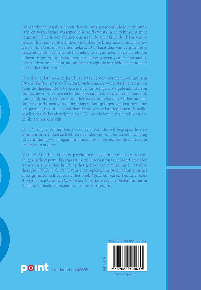 'TA elke dag' is een aanwinst voor een ieder die wil begrijpen hoe de communicatie tussen zichzelf en de ander verloopt en die de uitdaging tot verandering wil aangaan om meer plezier, respect en oprechtheid in het leven te ervaren.