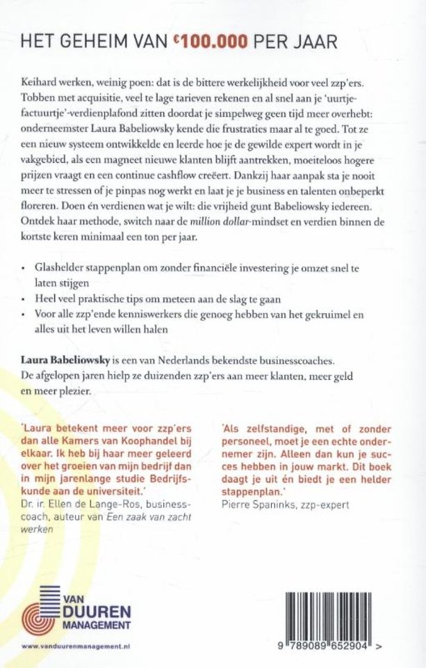 Meer over Laura BabeliowskyKeihard werken, weinig poen: dat is de bittere werkelijkheid voor veel zzp’ers. Tobben met acquisitie, veel te lage tarieven rekenen en al snel aan je 'uurtje-factuurtje'-verdienplafond zitten doordat je simpelweg geen tijd meer overhebt: onderneemster Laura Babeliowsky kende die frustraties maar al te goed. Tot ze een nieuw systeem ontwikkelde en leerde hoe je de gewilde expert wordt in je vakgebied, als een magneet nieuwe klanten blijft aantrekken, moeiteloos hogere prijzen vraagt en een continue cashflow creëert.