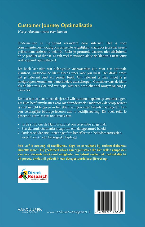 Dit boek laat zien wat belangrijke voorwaarden zijn voor een optimale klantreis, waardoor de klant steeds weer voor jou kiest. Het draait erom dat je relevant bent en gemak biedt. Om relevant te zijn, moet je je doelgroepen kennen en je merkbeleid aanscherpen. Gemak ervaart de klant als de klantreis vloeiend verloopt. Met een omnichannel omgeving zorg je daarvoor.