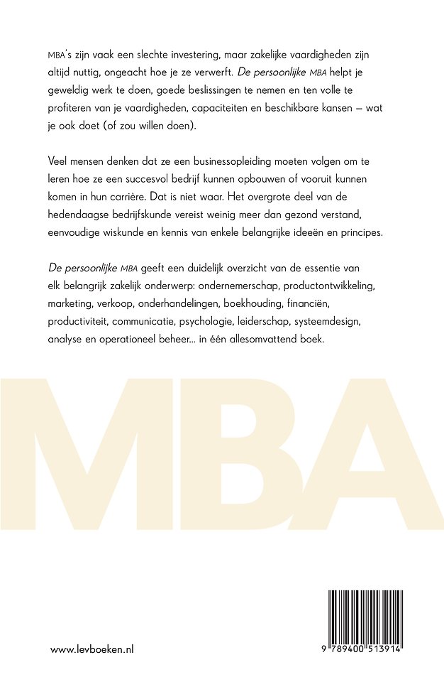 De persoonlijke MBA geeft een duidelijk overzicht van de essentie van elk belangrijk zakelijk onderwerp: ondernemerschap, productontwikkeling, marketing, verkoop, onderhandelingen, boekhouding, financiën, productiviteit, communicatie, psychologie, leiderschap, systeemdesign, analyse en operationeel beheer... in één allesomvattend boek.
