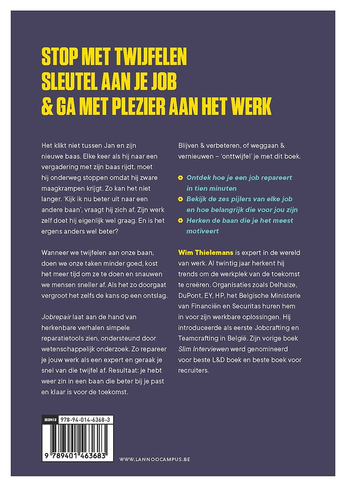 Jobrepair laat aan de hand van herkenbare verhalen simpele reparatietools zien, ondersteund door wetenschappelijk onderzoek. Zo repareer je jouw werk als een expert en geraak je snel van die twijfel af. Resultaat: je hebt weer zin in een baan die beter bij je past en klaar is voor de toekomst.