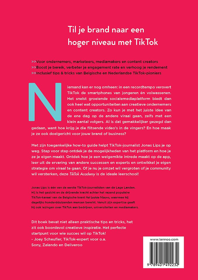 Met zijn toegankelijke how-to guide helpt TikTok-journalist Jonas Lips je op weg. Stap voor stap ontdek je de mogelijkheden van het platform en hoe je ze je eigen maakt. Ontdek hoe je een welgemikte intrede maakt op de app, leer uit de ervaring van andere successen en experts en ontwikkel je eigen strategie om viraal te gaan. Of je nu je omzet wil vergroten of je community wil versterken, deze TikTok Academy is de ideale leerschool!