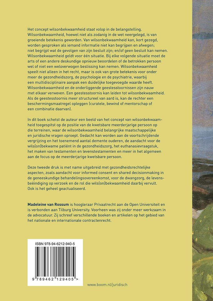 In dit boek schetst de auteur een beeld van het concept van wilsonbekwaamheid toegespitst op de positie van de kwetsbare meerderjarige persoon op die terreinen, waar de wilsonbekwaamheid belangrijke maatschappelijke en juridische vragen oproept. Gedacht kan worden aan de voortschrijdende vergrijzing en het toenemend aantal demente ouderen, de aandacht voor de wils(on)bekwame patiënt in de gezondheidszorg, het euthanasievraagstuk, het maken van testamenten en levenstestamenten en meer in het algemeen aan de focus op de meerderjarige kwetsbare persoon.