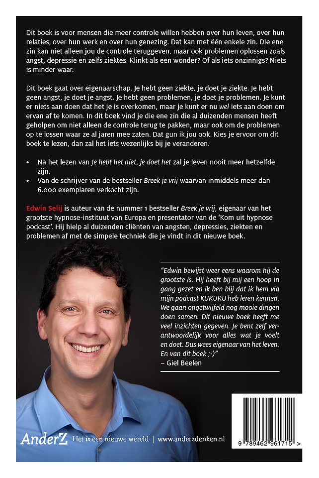 Meer over Edwin SelijDit boek is voor mensen die meer controle willen hebben over hun leven, over hun relaties, over hun werk en over hun genezing. Dat kan met één enkele zin. Die ene zin kan niet alleen jou de controle teruggeven, maar ook problemen oplossen zoals angst, depressie en zelfs ziektes. Klinkt als een wonder? Of als iets onzinnigs? Niets is minder waar.