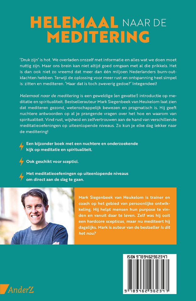 'Helemaal naar de meditering' is een geweldige (en gevatte!) introductie op meditatie en spiritualiteit. Bestsellerauteur Mark Siegenbeek van Heukelom laat zien dat mediteren gezond, wetenschappelijk bewezen en pragmatisch is. Hij geeft nuchtere antwoorden op al je prangende vragen over het hoe en waarom van spiritualiteit. Vind rust, wijsheid en zelfvertrouwen aan de hand van verschillende meditatieoefeningen op uiteenlopende niveaus.