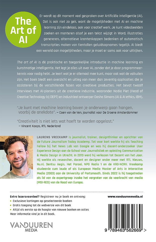 'The Art of AI' is dé praktische en toegankelijke introductie in machine learning en kunstmatige intelligentie. Het legt je alles uit over AI, zonder dat je daar programmeerkennis voor nodig hebt. Je leert wat je er allemaal mee kunt, maar ook wat de valkuilen zijn. Het boek biedt een overzicht en uitleg van meer dan zeventig applicaties die je assisteren bij de verschillende fasen van creatieve producties. Het bevat twaalf interviews met AI-pioniers uit de creatieve industrie, waaronder Nadia Piet (Head of Creative Technology bij DEPT) en industrieel ontwerper Dasha Simons (AI & AI ethics, IBM).