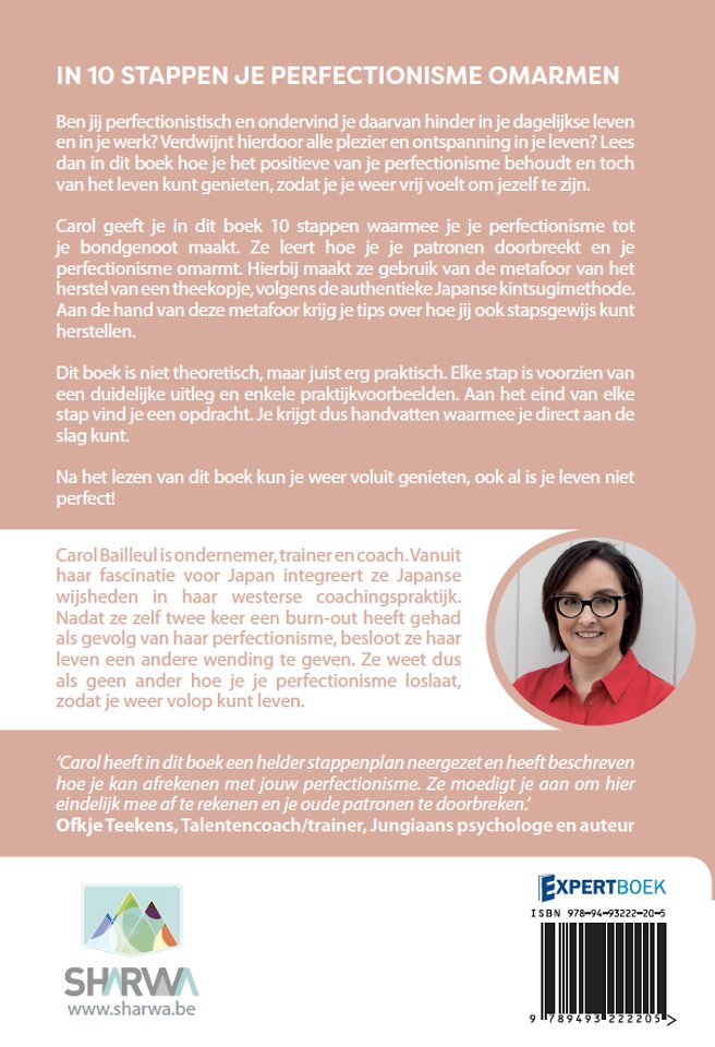Carol geeft je in dit boek 10 stappen waarmee je je perfectionisme tot je bondgenoot maakt. Ze leert hoe je je patronen doorbreekt en je perfectionisme omarmt. Hierbij maakt ze gebruik van de metafoor van het herstel van een theekopje, volgens de authentieke Japanse kintsugimethode. Aan de hand van deze metafoor krijg je tips over hoe jij ook stapsgewijs kunt herstellen.