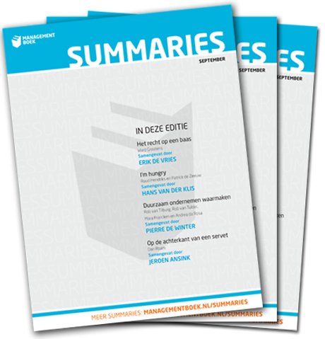 Meer over Pierre PieterseMet 'Management Summaries' blijft u op de hoogte van de ontwikkelingen binnen het managementgedachtegoed in slechts 12 uur per jaar. Twaalf keer per jaar selecteert onze redactie vanuit hun expertise 4 boeken, waarvan u bekend zou moeten zijn met de inhoud. Door deze titels voor u samen te vatten bent u in 1 uur per maand op de hoogte van de belangrijkste managementontwikkelingen. Managementjournalisten vatten de trendsettende boeken voor u samen, waardoor u zich eenvoudig dit gedachtegoed eigenmaakt.